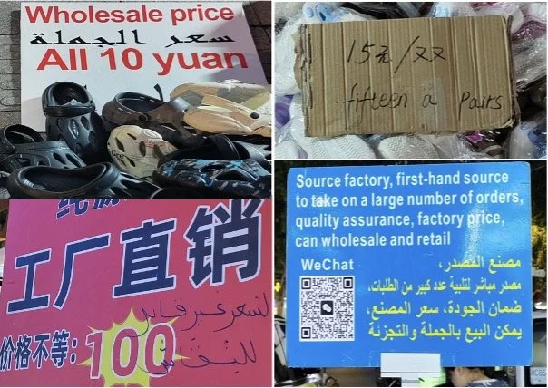 Such numerous people-to-people interactions create dynamic and complex sociolinguistic, anthropological, and sociological ecologies. Figure 7 top left shows a middle-aged Chinese lady selling fruits and drinks. Fascinatingly, as an example of grass-roots multilingual communication associated with low-end globalization, she puts up a sign featuring Chinese and Arabic. The sign says ‘cold watermelon’ in both languages, which makes sense given the fact that Arabic is a commonly understood language in Yiwu among foreign traders. Figure 7 top right illustrates an old Chinese lady providing shoe shining/cleaning service to a foreigner (presumably from India). This lady recently became an online celebrity on a few Chinese social media sites such as Douyin and Wechat, due to her ability to exhibit impressive multilingual repertoire in various languages such as English, Arabic and Spanish. She frequently greets foreign traders with ‘assalamu alaikum’ (greetings in Arabic), hello, and hola (greetings in Spanish). Figure 7 bottom illustrates a Chinese old lady selling fruits on a footbridge in Yiwu close to a major trading mall. She leans against a large multilingual advertising sign in English, Arabic (incorrectly formatted) and Spanish. Also, as a fascinating sight, in front of the Beyti restaurant, beggars greet Arab passers-by with ‘assalamu alaikum’ and ask for money. Clearly, multilingualism is a way of life in Yiwu. It is also a vital kind of ‘capital’ to make money and bring home the bacon. However, characteristic of such grass-roots communication is often the basic and imperfect use of language. This shows the often focus on functionality over complete grammaticality and perfection (Gu 2025) in an absolute sense. Sometimes, the use of language (e.g. English and Arabic) can be incorrect, difficult to understand or poorly formatted. The Arabic text in Figure 7 bottom, for instance, is incorrectly formatted. Figure 8 shows a sign ‘Code Proceeding’, whose meaning is unclear. This is probably a wrong translation of the Chinese phrase 断码处理 using translation software. The Chinese phrase should have been rendered as ‘odd size clearance’.